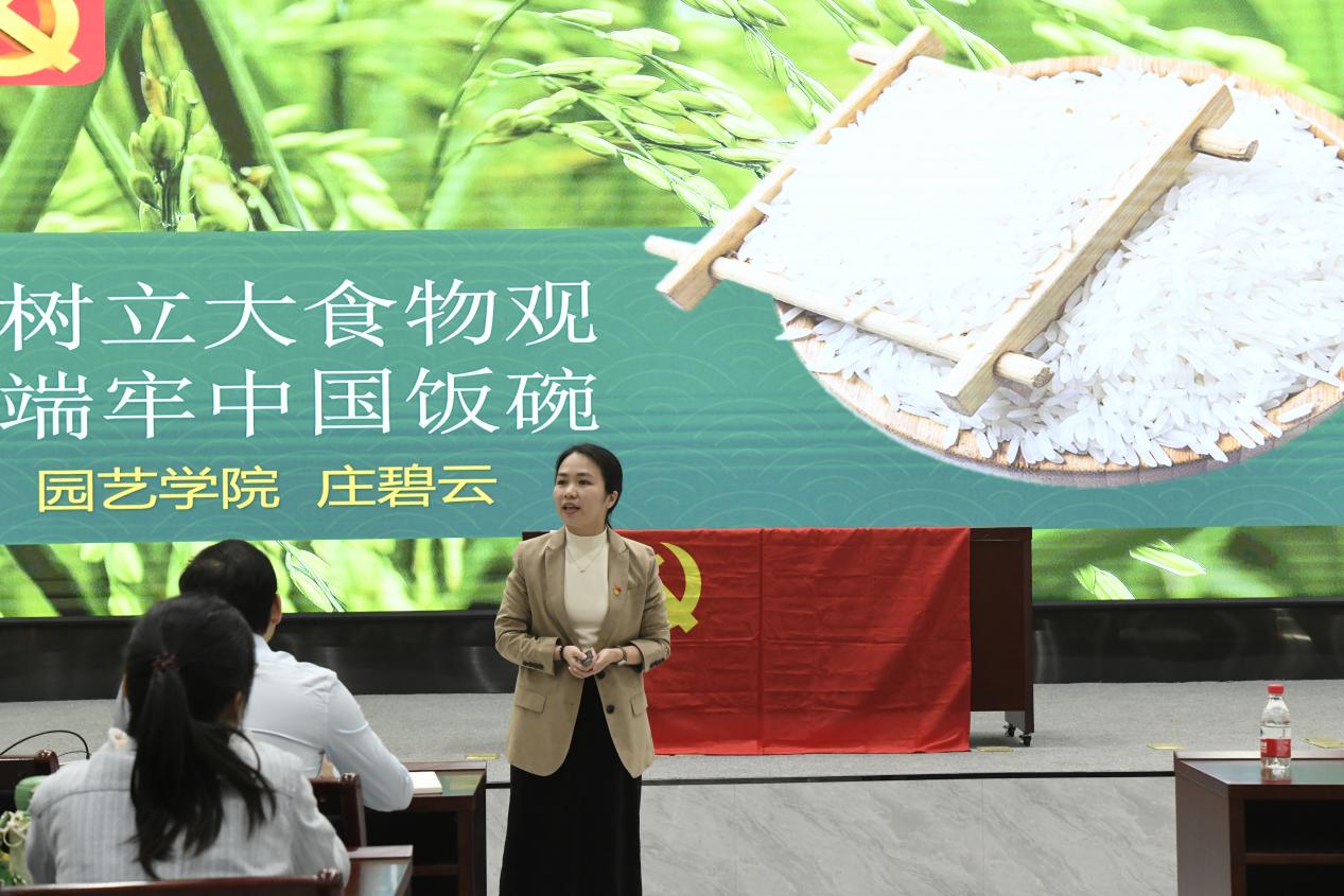 园艺学院学工办主任庄碧云同志结合学习贯彻党的二十大精神,为党员同志讲授了《树立大食物观端牢中国饭碗》的主题党课。党员同志从中了解到保证国家粮食安全的重要性以及丁颖院士、卢永根院士等优秀榜样对农业发展的贡献,这激励着研究生党员向老一辈科学家学习,传承他们以身许国、科技报国的崇高精神和深厚情怀。