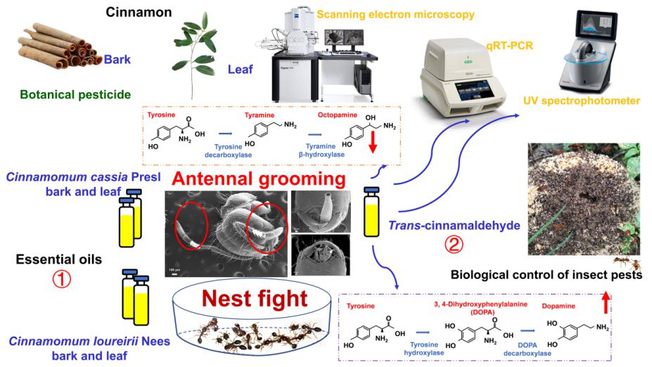 该成果分别研究了源于越南和中国肉桂品种的叶片和树皮精油,及其主要成分反式肉桂醛点触滴觅食工蚁触角对工蚁梳理触角、攻击行为,以及对体内生物含量的影响,揭示了肉桂精油引起红火蚁工蚁不正常梳理触角和内讧的行为,破坏触角上的毛器官,降低其识别同伴的能力;证明了反式肉桂醛是扰乱上述行为的主要成分,其原理是通过反式肉桂醛降低章鱼胺的含量来降低红火蚁工蚁的识别能力,同时通过提高多巴胺的含量来增强红火蚁的攻击行为。该研究揭示了反式肉桂醛可通过作用于红火蚁的神经系统来干扰工蚁的行为,从而引起红火蚁内讧和厮杀,为利用绿色天然成分肉桂精油控制红火蚁传播提供了新的思路和策略。