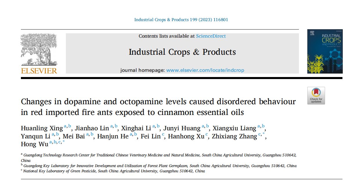 团队前期研究发现,肉桂精油对红火蚁具有很好的熏蒸致死效果,熏蒸机制可能是通过干扰红火蚁主要器官触角的感受器来扰乱其社会能力、寿命、攻击性等社会行为(Journal of Pest Science, 2022,6 DOI : 10.1007/s10340-022-01540-1(中科院农学一区TOP期刊,IF: 5.742))。近日,吴鸿教授团队与徐汉虹教授团队再次合作,在肉桂天然成分防治红火蚁杀虫机制上取得新进展,相关研究成果以“Changes in dopamine and octopamine levels caused disordered behaviour in red imported fire ants exposed to cinnamon essential oils”(论文链接:https://doi.org/10.1016/j.indcrop.2023.116801)为题目,在中科院农学一区TOP期刊《Industrial Crops & Products》((IF: 6.449)杂志上发表研究论文。suncity太阳新城2020级博士研究生邢欢铃为论文第一作者,我校药用植物研究中心吴鸿教授和绿色农药全国重点实验室张志祥教授为共同通讯作者。