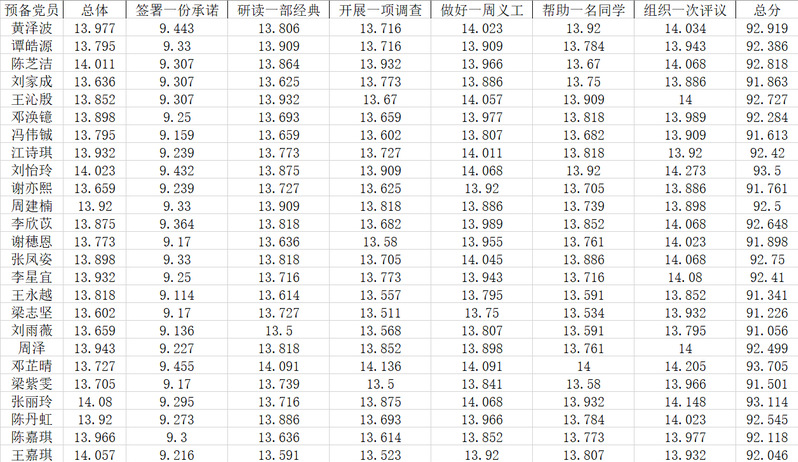 在前期开展多期“六个一”工程主题项目汇报、“六个一”工程成果展示等活动的基础上,组织我集团各学生党支部、团支部的党员、团员与群众对本学期即将预备期满的预备党员开展民主评议工作。经统计汇总,现将评议结果公示如下。