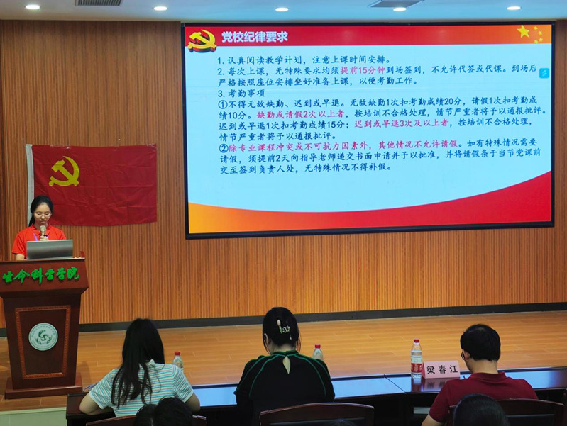 党务信息中心工作人员从申请入党、入党积极分子的确定和培养、发展对象的确定和考察、预备党员的接收和转正几个阶段为学员们详细介绍了入党的基本流程,进一步加深了学员们对入党择优性、严格性和庄严性的认识,还为学员们详细讲解了培训班的课程安排、考核及纪律要求以及分组安排。