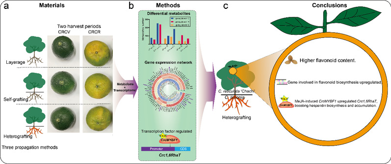 团队针对生产上不同繁殖方式对茶枝柑品质形成的生物学机制不清问题,通过对果园传统的圈枝、自嫁接和异嫁接茶枝柑小青柑和大红柑时期代谢组和转录组联合分析,发现以红柠檬为砧木的茶枝柑果皮中重要生物活性成分橙皮苷、川陈皮素、橘皮素、柚皮素、去甲基川陈皮素和甜橙黄酮的含量均高于圈枝和自嫁接。通过基因共表达网络鉴定出一个调控茶枝柑果皮橙皮苷合成与积累的转录因子CrcMYB1,并证实其在嫁接植株中通过MeJA促进CrcMYB1的表达,进而直接调控Crc1,6RrhaT的表达以促进茶枝柑果皮中橙皮苷的合成与积累。研究结果为不同嫁接的茶枝柑果实药用价值评价、高质量广陈皮生产、优化嫁接技术等提供了生物学基础理论指导。