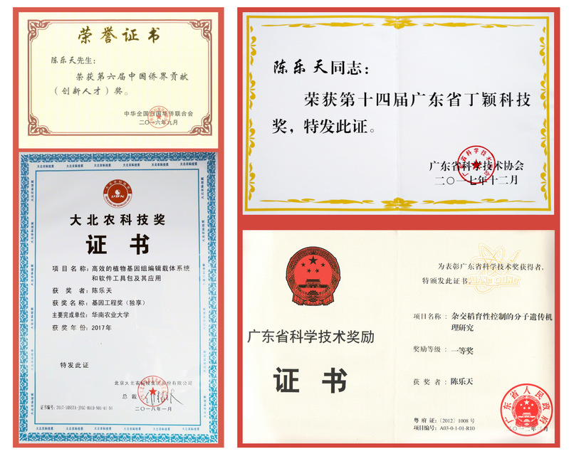 截止2021年底,陈乐天在学术上主持、参加各类课题20余项。在水稻杂种优势利用相关性状分子机理方面取得一系列重要成果,在Annu.Rev.Plant Biol、Cell Host Microbe、Nat.Commun、Mol.Plant、Plant Cell等刊物发表论文68篇,累积SCI影响因子(IF) 500多,论文被引用超过4500次。申请发明专利10余项(授权8项),出席国内外学术会议并做大会报告30余次。荣获中国侨界(创新人才)贡献奖、广东省丁颖科技奖、大北农科技奖(第4)等奖励。指导大学生在iGEM国际大赛中获得国际金奖4项,银奖1项,单项奖4项。